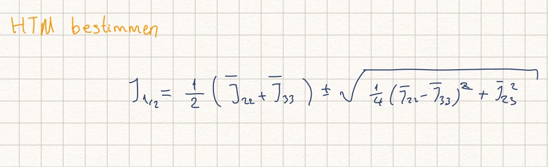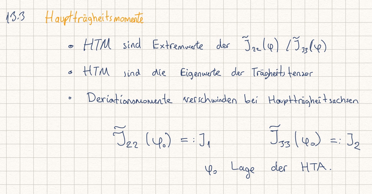 Die berechnete FT. Momente hängen von dem Translationswinkel phi ab. Daraus können wir einen Extremwertproblem herleiten, und mit denen können wir die Hauptträgheitsmomente berechnen. Diese HTM sind die Eigenwerte der Trägheitstensor J und sind die Extremwerte der Trägheitsmomente.