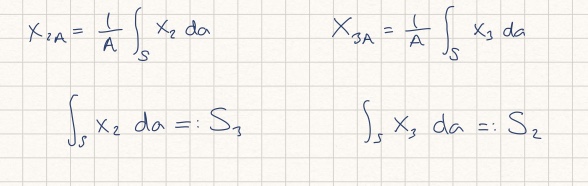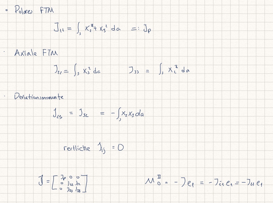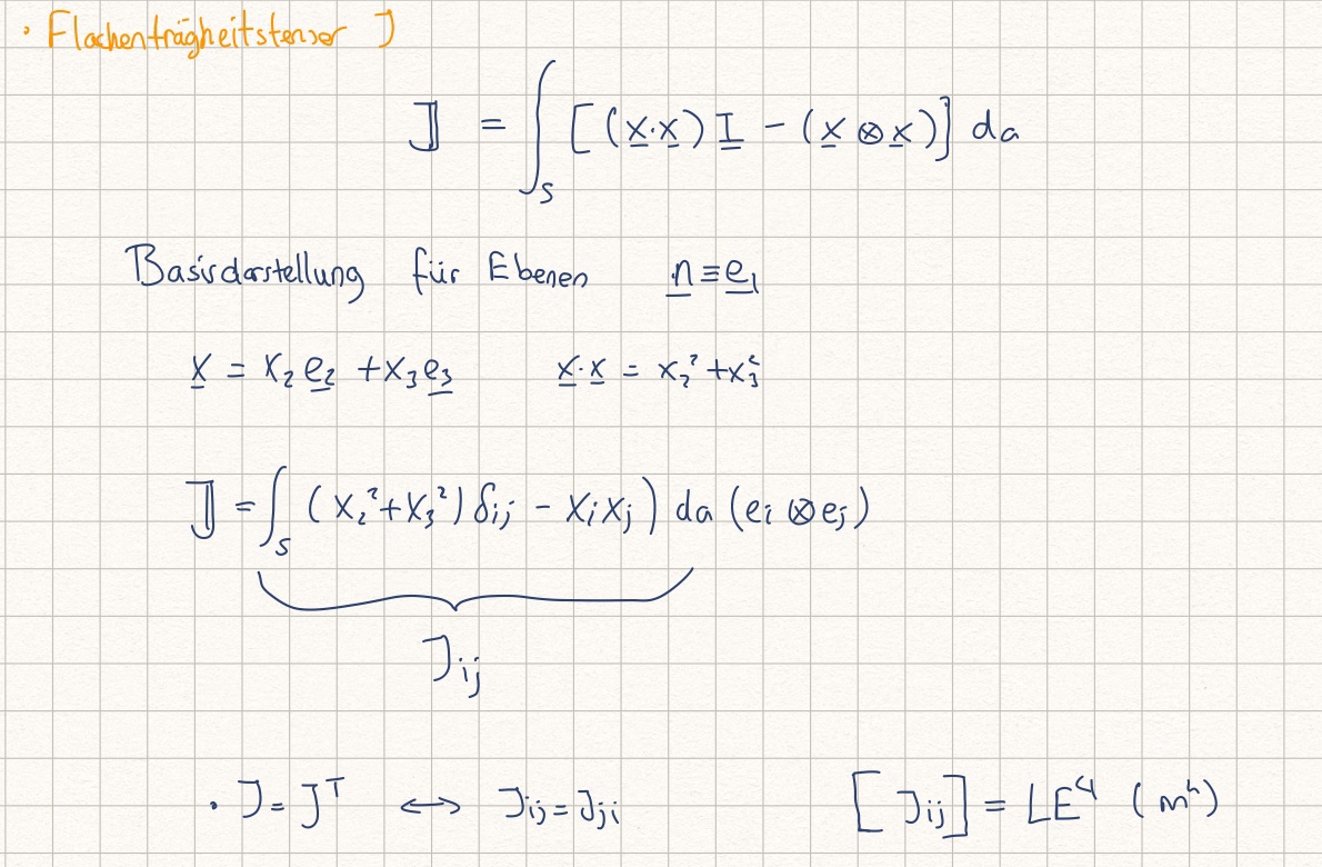 Die Berechnung der Moment einer Moment erzeugt ein Tensor, die als Flächenträgheitstensor J bezeichnet wird. J ist ein symmetrisches Tensor, deswegen ist J_23=J_32. Die Komponente der Flächenträgheitstensor heißen Flächenträgheitsmomente.
