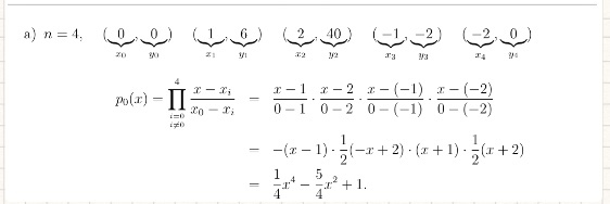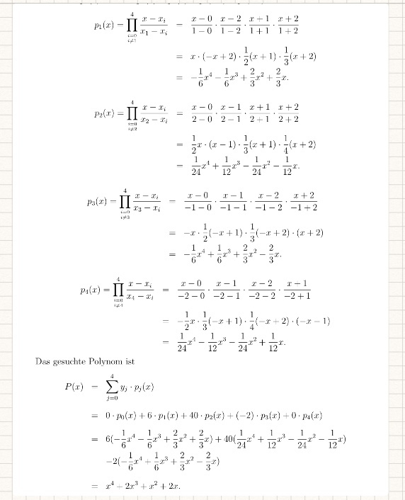 Sei P eine Polynom max. 4. Grades. Wir berechnen die Lagrange-Polynomen p_0 bis p_4. Danach multiplizieren wir deren Werte mit dem entsprechenden Messwerten.